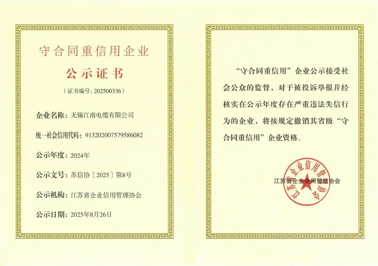 近日,江蘇省企業(yè)信用管理協(xié)會(huì)發(fā)布2024年度省級(jí)“守合同重信用”公示企業(yè)名單,江南電纜再次獲評(píng)“省級(jí)守合同重信用”企業(yè)。
